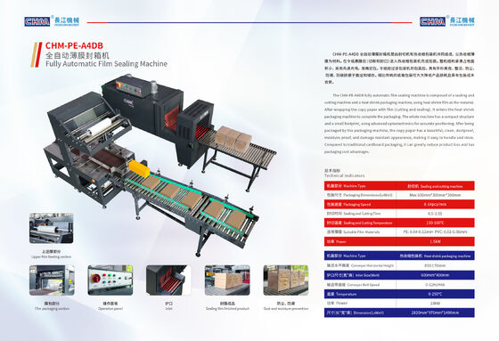 The CHM-PE-A4DB fuly automatic film sealing machine is composed of a sealing and cutting machine and a heat shrinkpackaging machine, using heat shrink film as the material. After wrapping the copy paper with film (cutting and sealing), itenters the heat shrink packaging machine to complete the packaging.