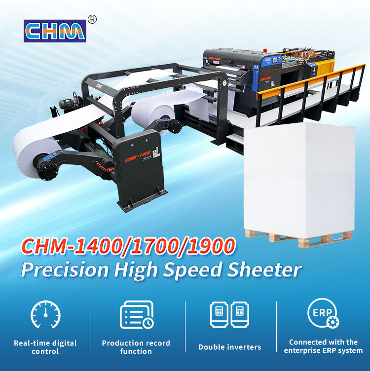 CHM Machinery's main products is a computerized high-precision single rotray sheeter, designed specifically for paper mills, paper distributors, and printing houses. It improves slitting capacity and ensures quality. This single-drum sheeter features a "Top blade rotary, bottom blade fixed" flying shear design. During paper transport, the lower blade remains stationary while the upper blade rotates continuously at high speed. This machine handles paper sizes from 60 to 550 gsm.