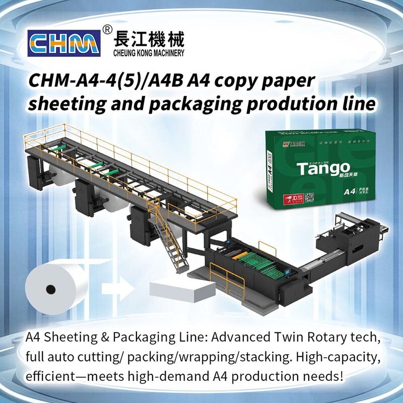 CHM-A4-4/5 high-speed production line with output of 20/25/35 reams per minute, capable of 20/25/30 tonnes in 8 hours. This A4 copy paper sheeter production line is specifically designed for efficient cutting of A4 copy paper, suitable for general A4 paper, A3 paper, and art paper. Featuring advanced cutting technology and optimized cutting modes, it delivers rapid, precise cutting to specified dimensions. The equipment boasts simple structure, easy operation, and high cutting precision. Custom sizes available including American size and test paper size.